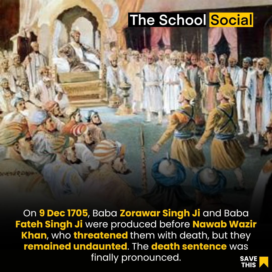 On December 9, 1705, Sahibzada Baba Zorawar Singh Ji and Sahibzada Baba Fateh Singh Ji were produced before Nawab Wazir Khan in Sirhind. Despite facing threats of death, the young Sahibzadas remained undaunted and unwavering in their commitment to their faith and principles. Nawab Wazir Khan, in the face of their steadfastness, eventually pronounced the death sentence.