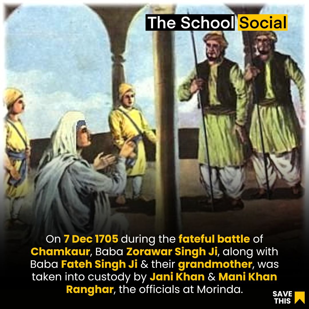 During the fateful battle of Chamkaur on December 7, 1705, Sahibzada Baba Zorawar Singh Ji and Sahibzada Baba Fateh Singh Ji, the younger sons of Guru Gobind Singh Ji, along with their grandmother Mata Gujri Ji, were taken into custody by Jani Khan and Mani Khan Ranghar, who were officials at Morinda.