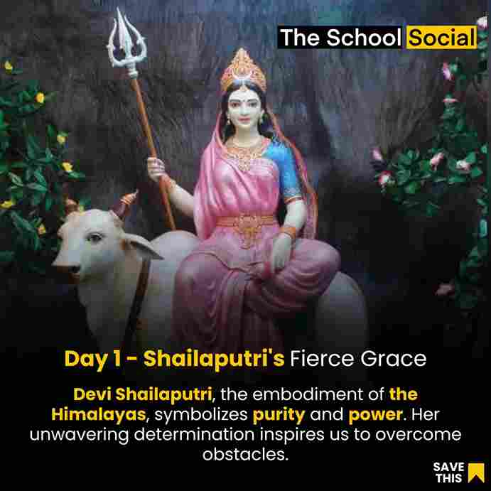On the first day of Navratri, devotees worship Maa Shailaputri, who is considered to be the embodiment of the Goddess Parvati. "Shailaputri" translates to "daughter of the mountains," and she is so named because she is the daughter of King Himavan, the personification of the Himalayan mountains.