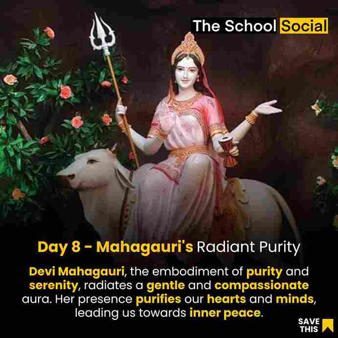 Devi Mahagauri is the eighth form of Goddess Durga, and she is worshipped on the eighth day of Navratri. Her name "Mahagauri" translates to "extremely white" or "very fair," and she is often depicted as having a radiant and fair complexion. She is considered to be the young and rejuvenated form of Goddess Parvati, after her penance and austerities.