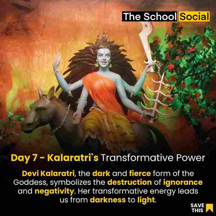Devi Kalaratri is the seventh form of Goddess Durga and is worshipped on the seventh day of Navratri. Her name, "Kalaratri," translates to "the night of death." She is often depicted with a dark complexion and a fierce and menacing appearance. Kalaratri is usually depicted with four arms, riding a donkey, and carrying a sword and a deadly iron hook. Her fearsome appearance symbolizes the destructive aspect of the Goddess, where she annihilates evil forces, ignorance, and negativity. Devotees believe that her fierce nature is meant to protect them from harm and to eradicate all forms of darkness and malevolent influences. Worship of Devi Kalaratri is performed to seek her blessings for protection, strength, and the elimination of obstacles. Her destructive form is seen as a means to annihilate one's fears, doubts, and negativities, paving the way for spiritual and personal growth.