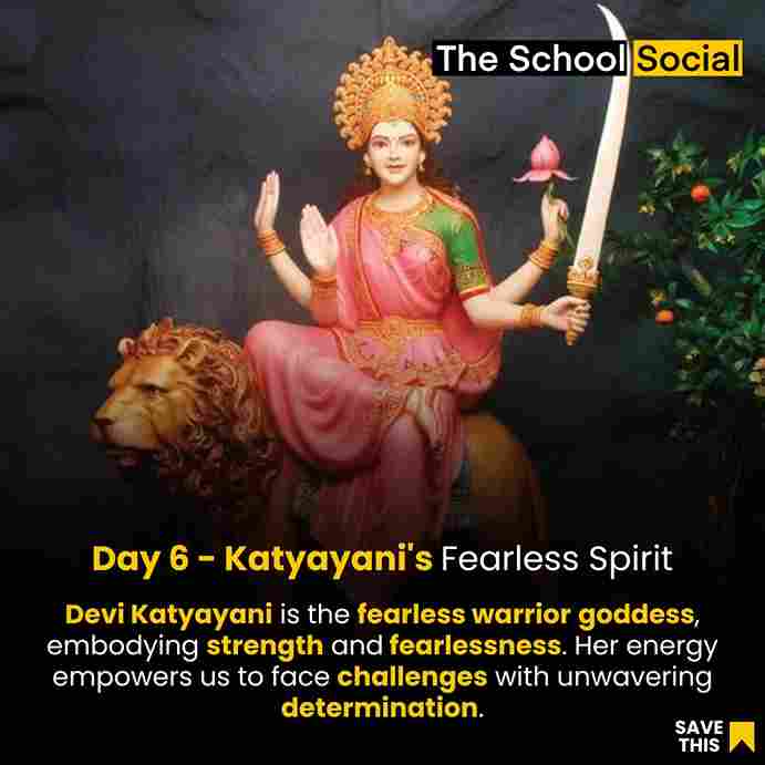 Devi Katyayani is the sixth form of Goddess Durga and is worshipped on the sixth day of Navratri. She is also known as "Katyayani Mata." Her name is derived from the fact that she is said to have been born to the sage Katyayana as an incarnation of Goddess Parvati. Devi Katyayani is a powerful and fierce manifestation of the Goddess, and she is often depicted with several arms and various weapons.