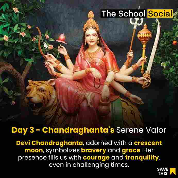 Devi Chandraghanta is the third form of the Goddess Durga, and she is worshipped on the third day of Navratri. Her name "Chandraghanta" is derived from two words: "Chandra," which means the moon, and "Ghanta," which means bell. She is often depicted with a half-moon on her forehead and a bell-shaped ornament, symbolizing her association with the moon. Devi Chandraghanta is depicted with a fierce and radiant demeanor, riding a tiger, and she is adorned with various weapons and jewels. She has ten hands, each carrying different objects and weapons, including a sword, a trident, a bow, an arrow, a lotus flower, a bell (ghanta), and a mace. The image of her on a tiger symbolizes her strength and courage.