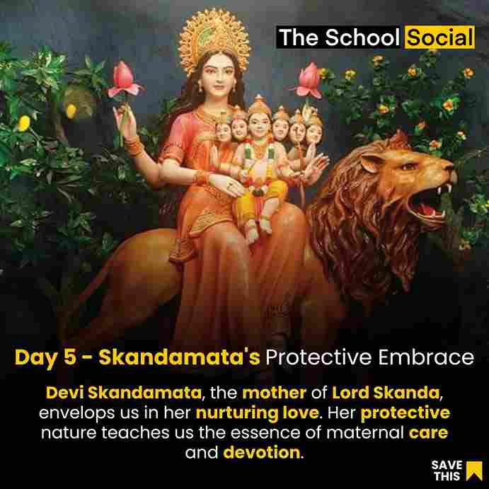 Devi Skandamata is the fifth form of the Goddess Durga, and she is worshipped on the fifth day of Navratri. Her name is derived from two words: "Skanda," which refers to Lord Kartikeya (also known as Skanda), the son of Goddess Parvati, and "Mata," which means mother. Devi Skandamata is the mother of Lord Kartikeya, and she is often depicted holding her infant son in her lap or arms.