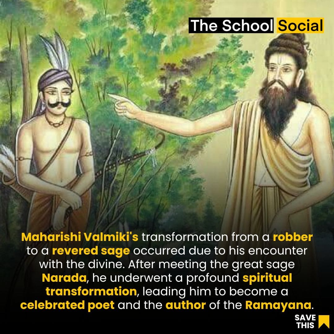 The story of Maharishi Valmiki's transformation from a robber to a revered sage is indeed a significant part of his legend. According to Hindu mythology, Valmiki's transformation was catalyzed by a divine encounter, particularly his meeting with the great sage Narada.